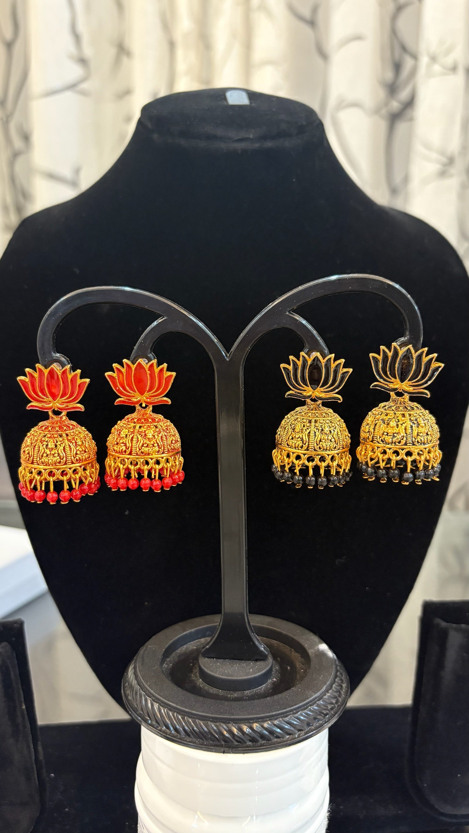 Make a statement with these striking Big Lotus Jhumkas, where traditional craftsmanship meets contemporary elegance. Each piece features an intricately carved lotus motif—a symbol of purity and grace—suspended from delicate hooks that catch light beautifully. The generous size ensures these earrings command attention while remaining comfortable for extended wear. Perfect for festive occasions, weddings, or anyone seeking to elevate their everyday style with a touch of botanical-inspired sophistication. A timeless addition to any jewelry collection.