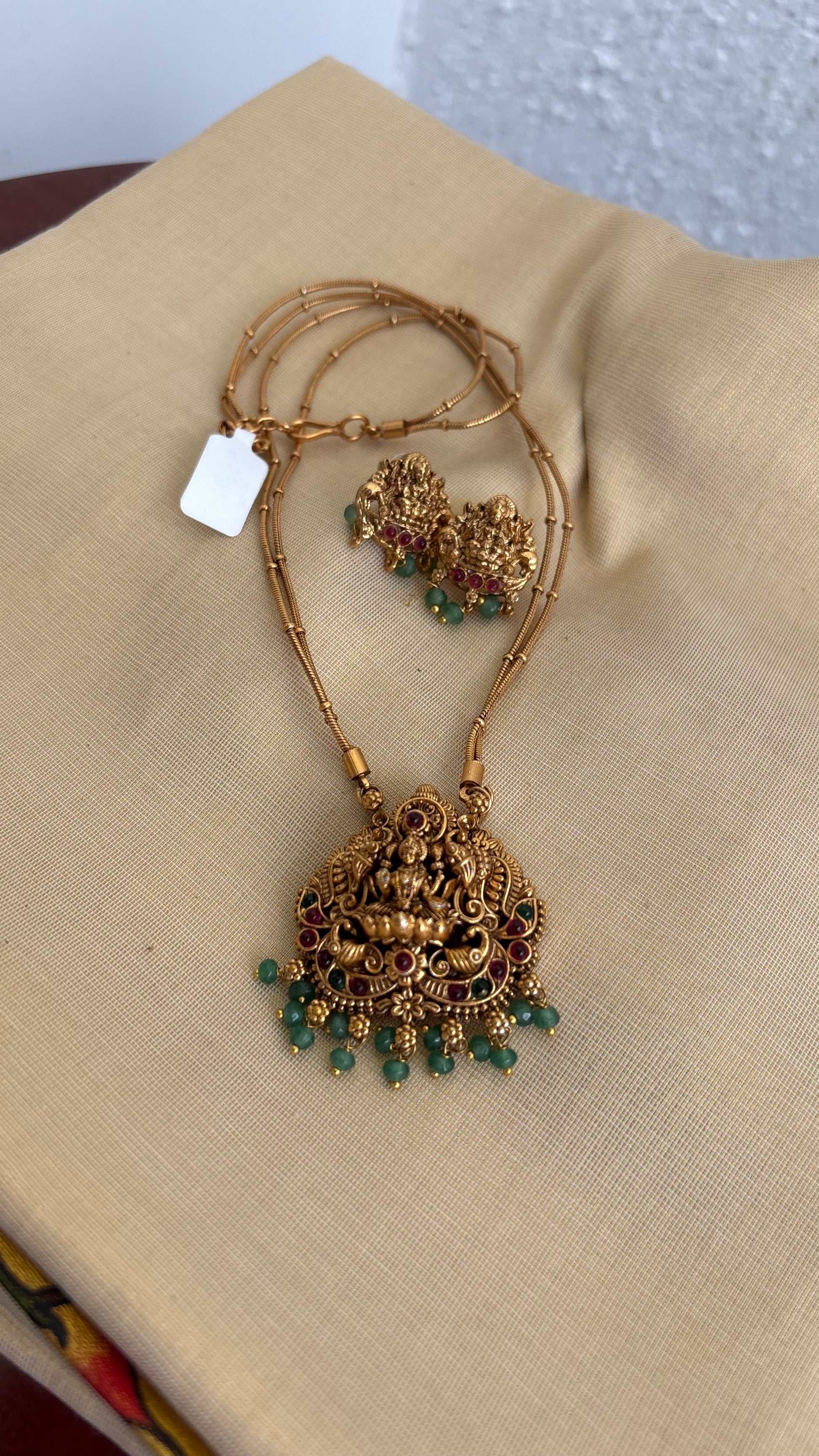 The Double Chain Lakshmi Haram is an exquisite temple-style necklace set featuring a prominent Lakshmi pendant. The pendant is enhanced with striking red stones and green beads, reflecting traditional artistry. Ideal for festive occasions, this set combines elegance and cultural significance, making it a valuable addition to any jewelry collection.